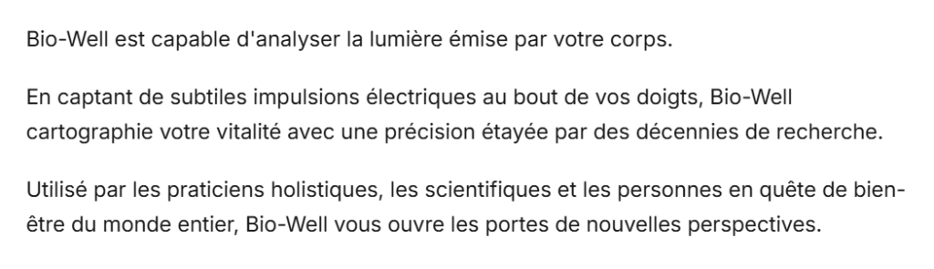 Bio-Well capte et analyse cette énergie rayonnante. Chaque analyse Bio-Well mesure l’état énergétique d’une personne, offrant ainsi une analyse détaillée de l’énergie de chacun de ses organes et systèmes.
